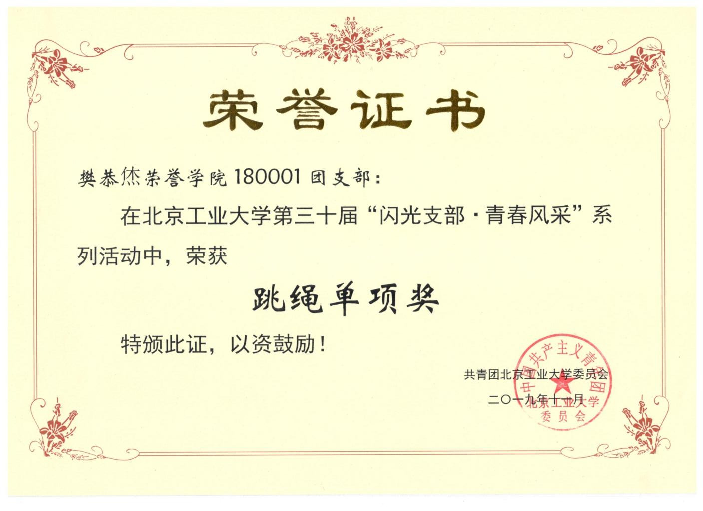 180001团支部 荣获 闪光支部 青春风采 跳绳单项奖