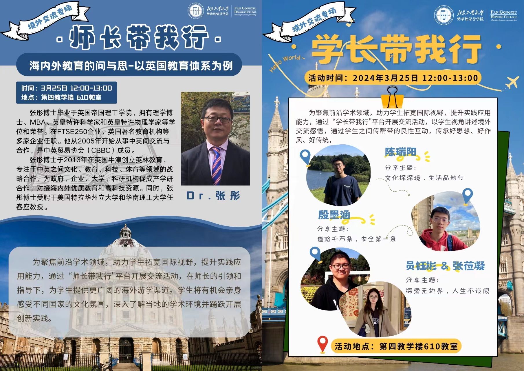 通过“师长学长带我行"平台开展交流活动,为学生提供更广阔的海外游学渠道,带领学生感受不同国家的文化氛围,深入了解当地的学术环境并踊跃开展创新实践。此外,通过学生视角讲述境外交流感悟,不仅能够促进新老生之间传帮带的良性互动,更有助于传承好思想、好作风、好传统。
