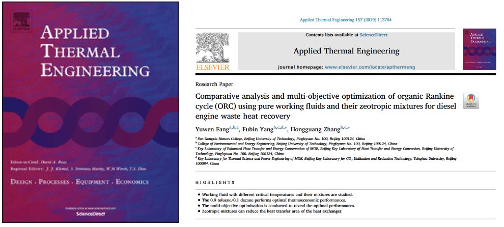 2015级本科生方钰文同学(能源与动力工程专业)以第一作者身份在SCI期刊《Applied Thermal Engineering》(JCR Q1,影响因子3.771,CiteScore 4.14,工程大类2区)上发表了题为Comparative analysis and multi-objective optimization of organic Rankine cycle (ORC) using pure working fluids and their zeotropic mixtures for diesel engine waste heat recovery的学术论文。《Applied Thermal Engineering》是热力工程领域影响力较高的权威学术期刊之一,主要关注能源生产、存储、利用以及节能等热过程所涉及的装备、技术方面的创新研究。该论文为我院本科生首次以第一作者身份在SCI期刊上发表的学术论文。