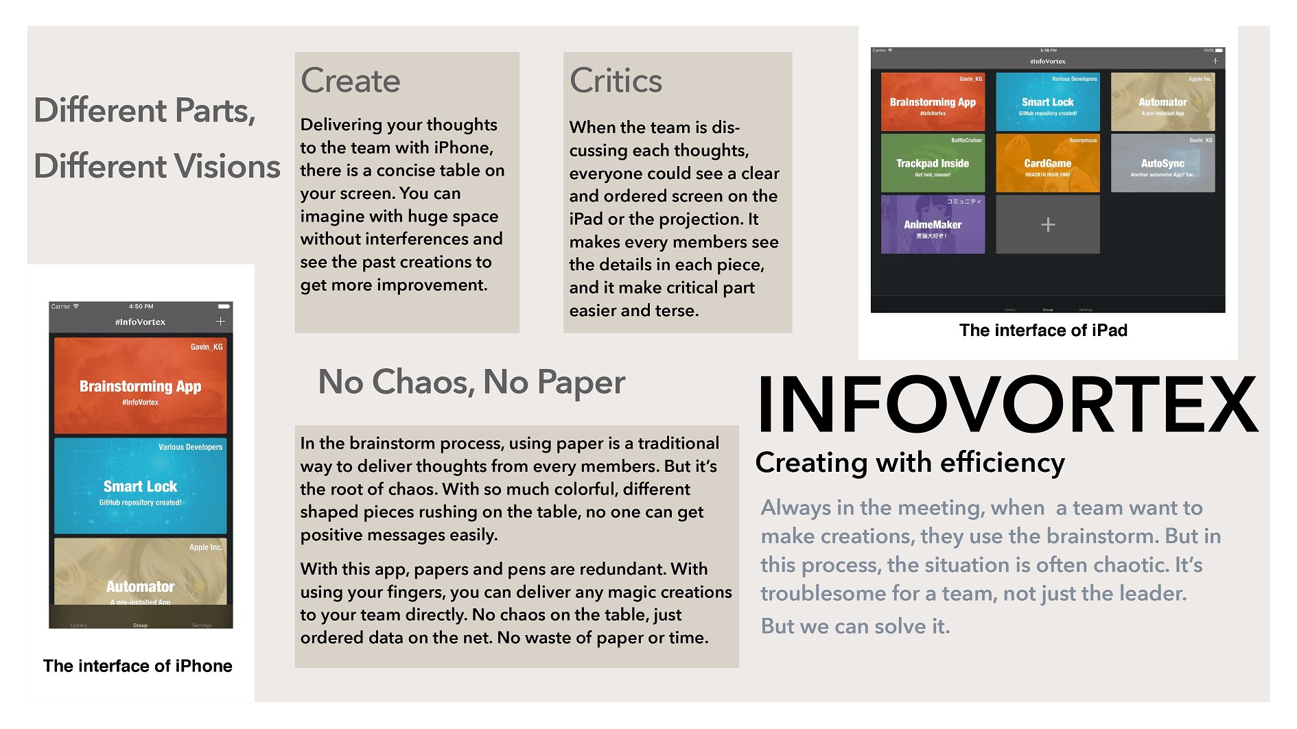 的高锴庚、邓华龙同学从361支参赛队伍中脱颖而出,进入最后参加决赛的30支队伍。他们所开发的InfoVortex软件是一个日常使用的效率型软件,致力于帮助人们更好的进行头脑风暴及创新思考,并将创新思想传播到每个人,增强全民的创新能力。经过软件介绍演示、专家评审等环节,最终获得了2016 年中国高校计算机大赛——移动应用创新赛决赛二等奖和专项奖“用户体验奖”。