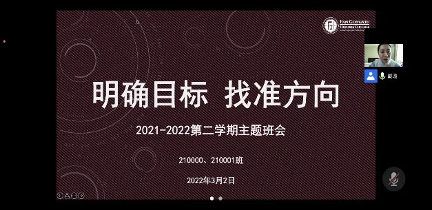 在线开展了“课‘樊’业渐重,道远志在前”主题班会。本次班会,辅导员戴璐老师面向全体同学开展了防疫防控安全教育,总结了假期的学生工作,并部署了新学期工作内容,对新生年的时间线进行了梳理和分享。开学动员旨在激发同学的学习动力,志在消灭“假期综合征”,全体同学为第一周的线上课程做好充足准备,同时明确了返校的具体时间和注意事项。