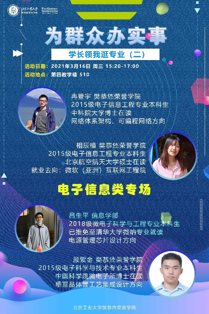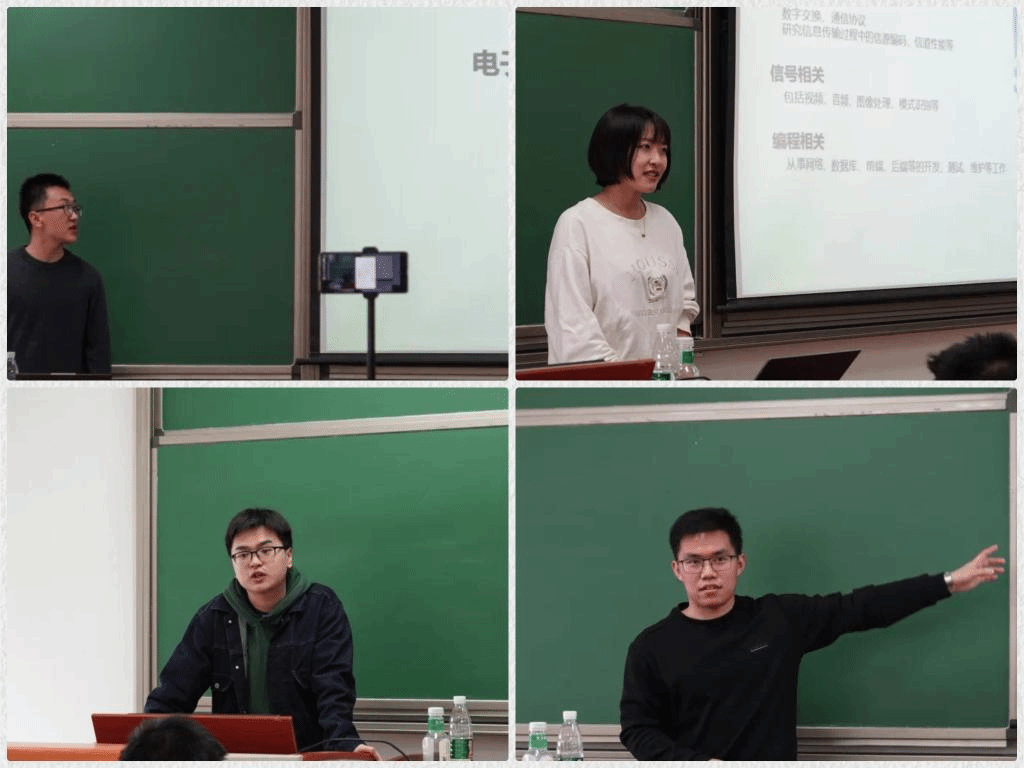 邀请了2015级电子信息工程专业的冉登宇学长和相辰橦学姐,2015级电子科学与技术专业的颜紫金学长和2018级微电子科学与工程专业的吕生平学长,活动由班主任助理陈宇卿主持。