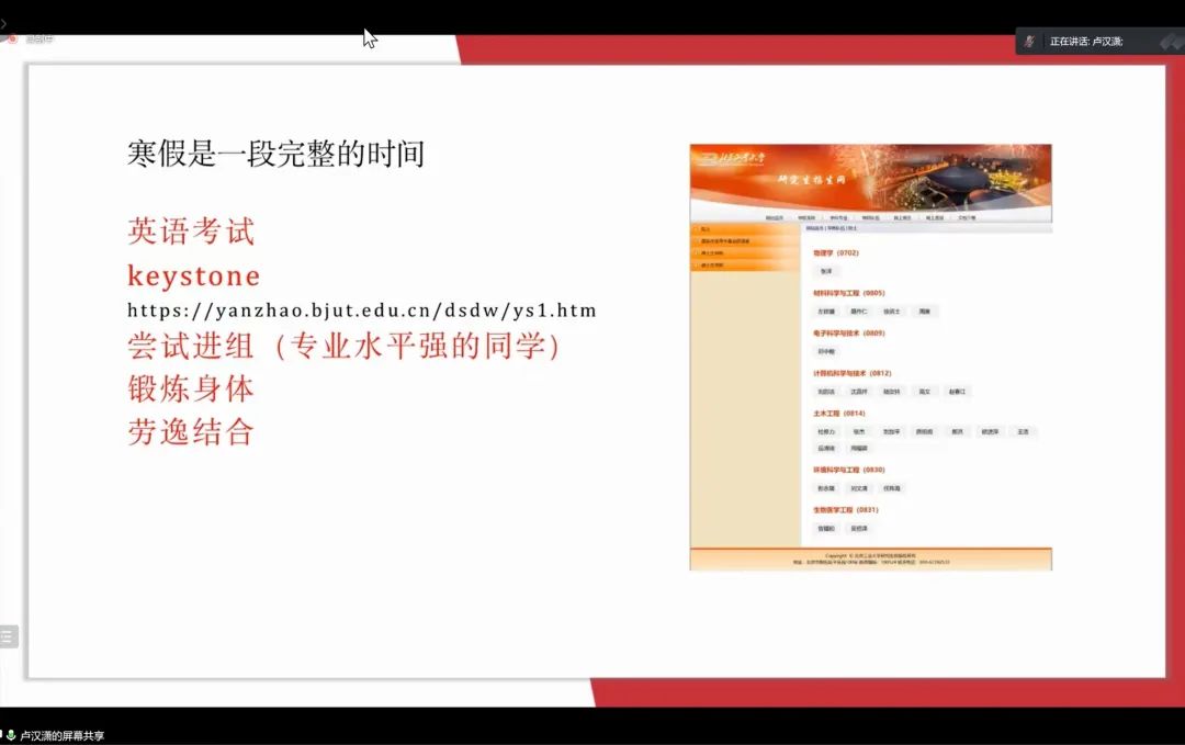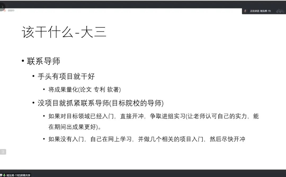 对于大一,大二的同学,褚泓博学长建议利用寒假这段完整的时间投身于自己感兴趣的竞赛之中。对于stone项目,寒假也是知识储备和项目进展的重要时期。此外,同学们还要勇于试错,找到自己感兴趣的方向。对大三保研的同学,学长建议要利用寒假确定研究方向,选择目标学校和导师,他重点对选择导师的流程和方法进行了演示。最后,他告诉同学们要放平心态、保持锻炼、敢想敢干。