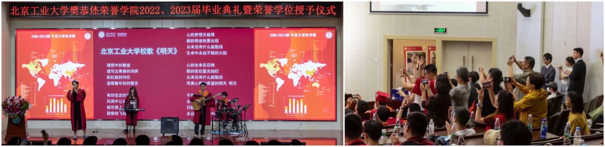 典礼的最后,190001班的乐队献上了三首悠扬动听的歌曲,悦耳的歌声尽显恣意的青春风采,伴随着最后的曲目——190001班班歌的飘扬,全体2023届毕业生缓步走上台前,共同站在聚光灯下,唱响这一曲青春之歌。毕业的喜悦与对未来的憧憬,不舍与留恋在这一刻交融在每一个人的心头,仿佛希望这一瞬能够永恒持续下去,无限远,无限久。但也正如班歌中所唱响的一样“或许有一天我们会走向了各自的生涯,在这里我们共同坚信着,新的一年,我们一定会更好。”
