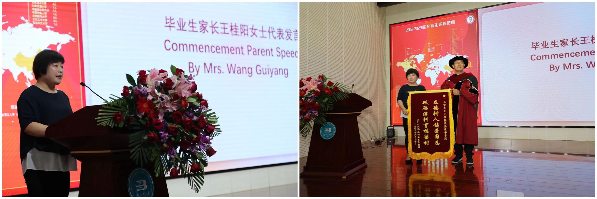 随后毕业生家长代表王桂阳女士发言,她从一位陪伴者、长辈的关怀出发,勉励大家坚定自己的选择与信念,争做时代的弄潮儿。最后也为大家赠言践行,“任重道远需策马,风正潮平好扬帆”,希望大家保持永不服输、永不言败的精神,在国家发展、民族复兴、人类进步的历史进程中贡献青春力量,在最好的时代成就最精彩的人生。王桂阳女士还作为家长代表为爱情岛
