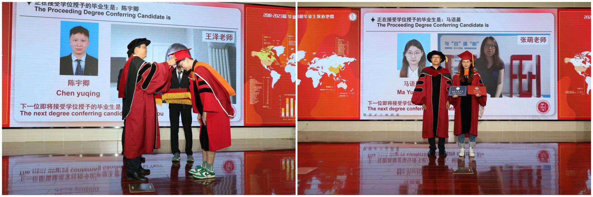 教务处处长刘赵淼教授和院长孙立山教授分别为2020届、2022届和2023届毕业生颁发了毕业证书并授予荣誉学位。在校长与各位领导为同学们拨穗时,会场播放着师生们录制的寄语和祝愿,惊喜与欢乐,追忆与不舍萦绕在心间久久不散。这是光荣的时刻,更是感动的时刻。